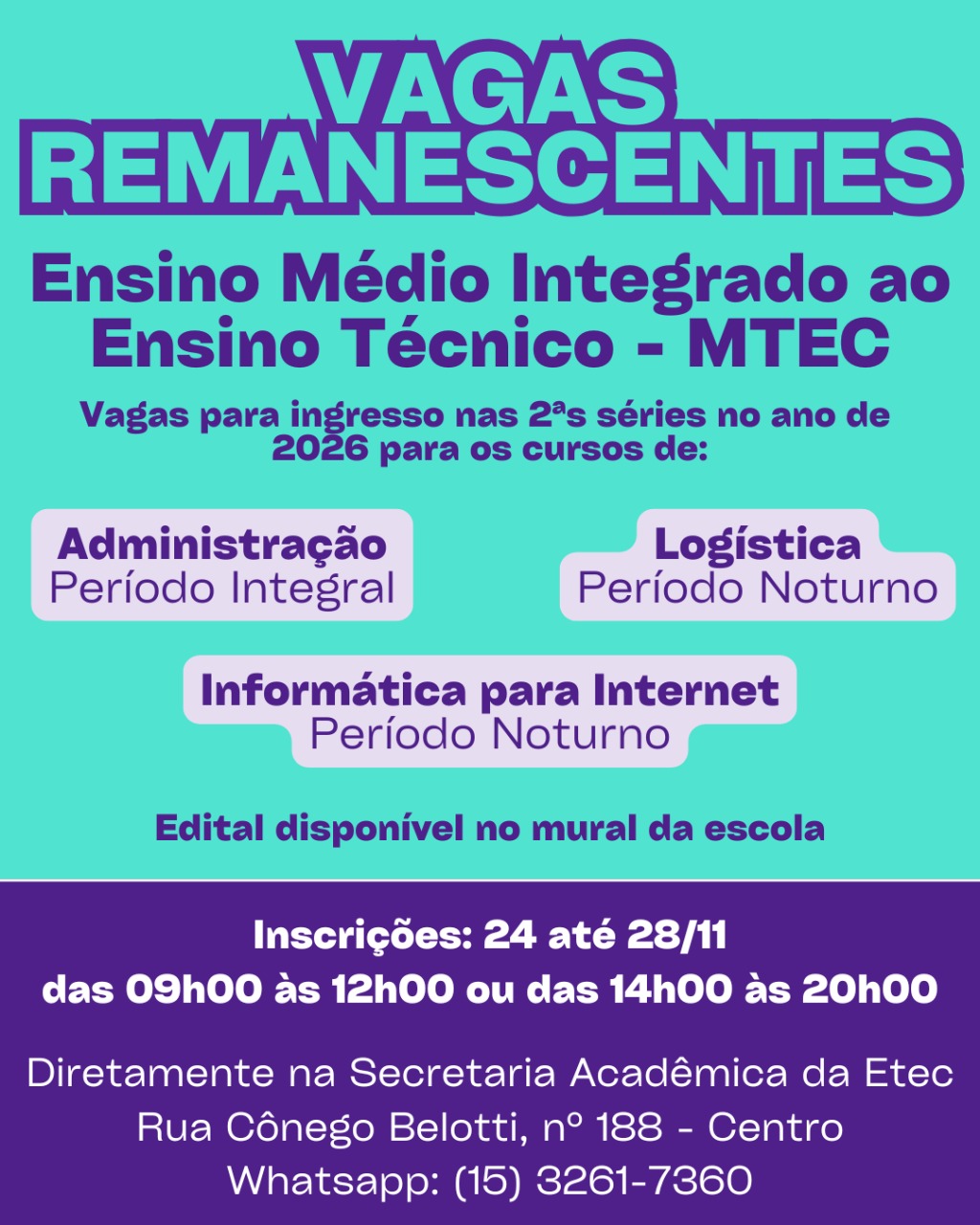 A Etec de Porto Feliz torna publica a abertura das inscrições para o Processo Especial de Seleção de Candidatos para o Preenchimento de Vagas Remanescentes da 2ª série do Ensino Médio. Editais para: 2º série […]